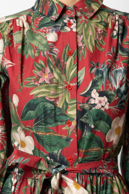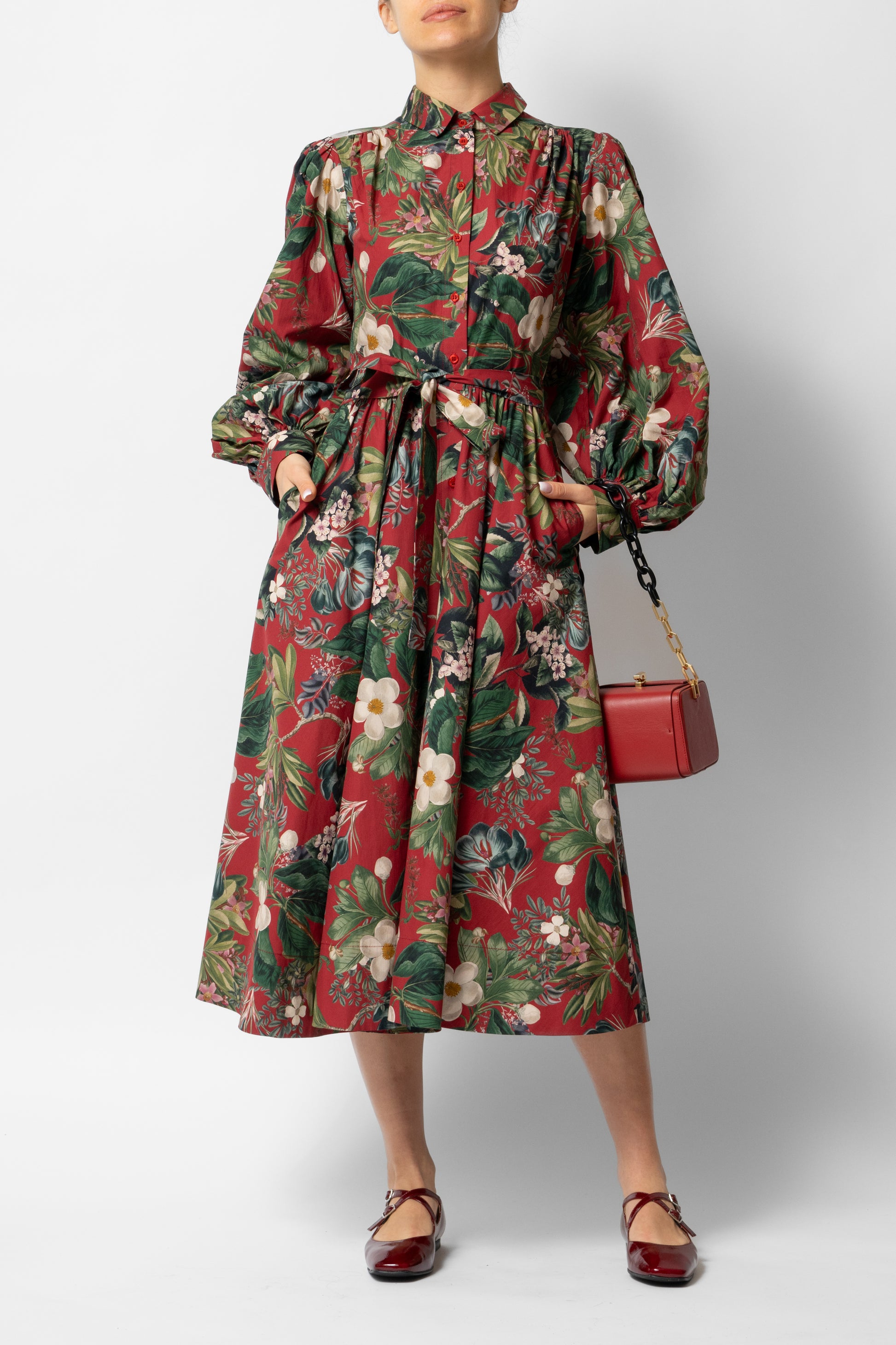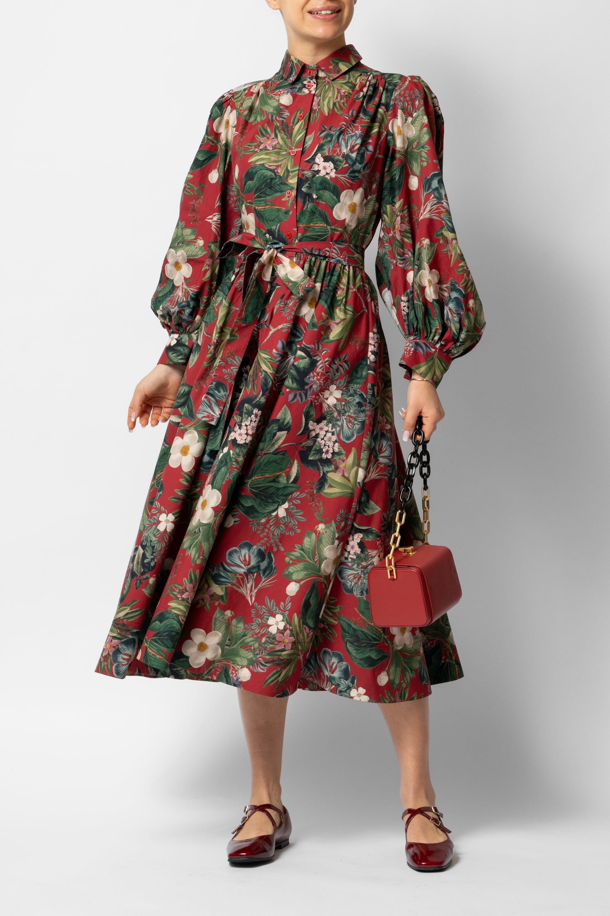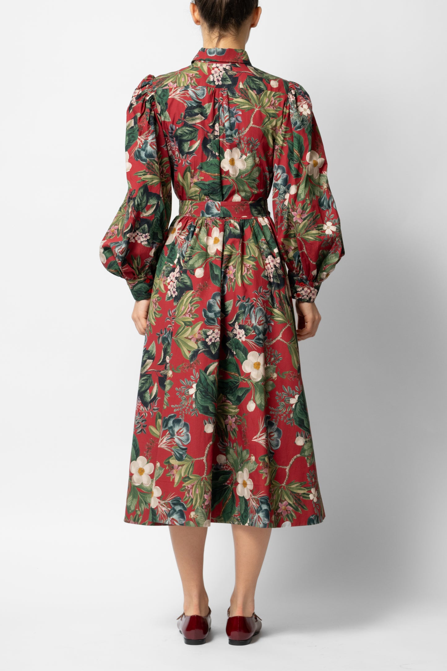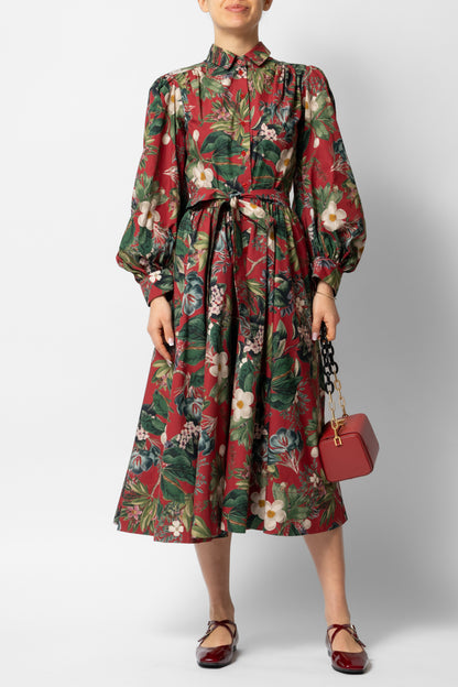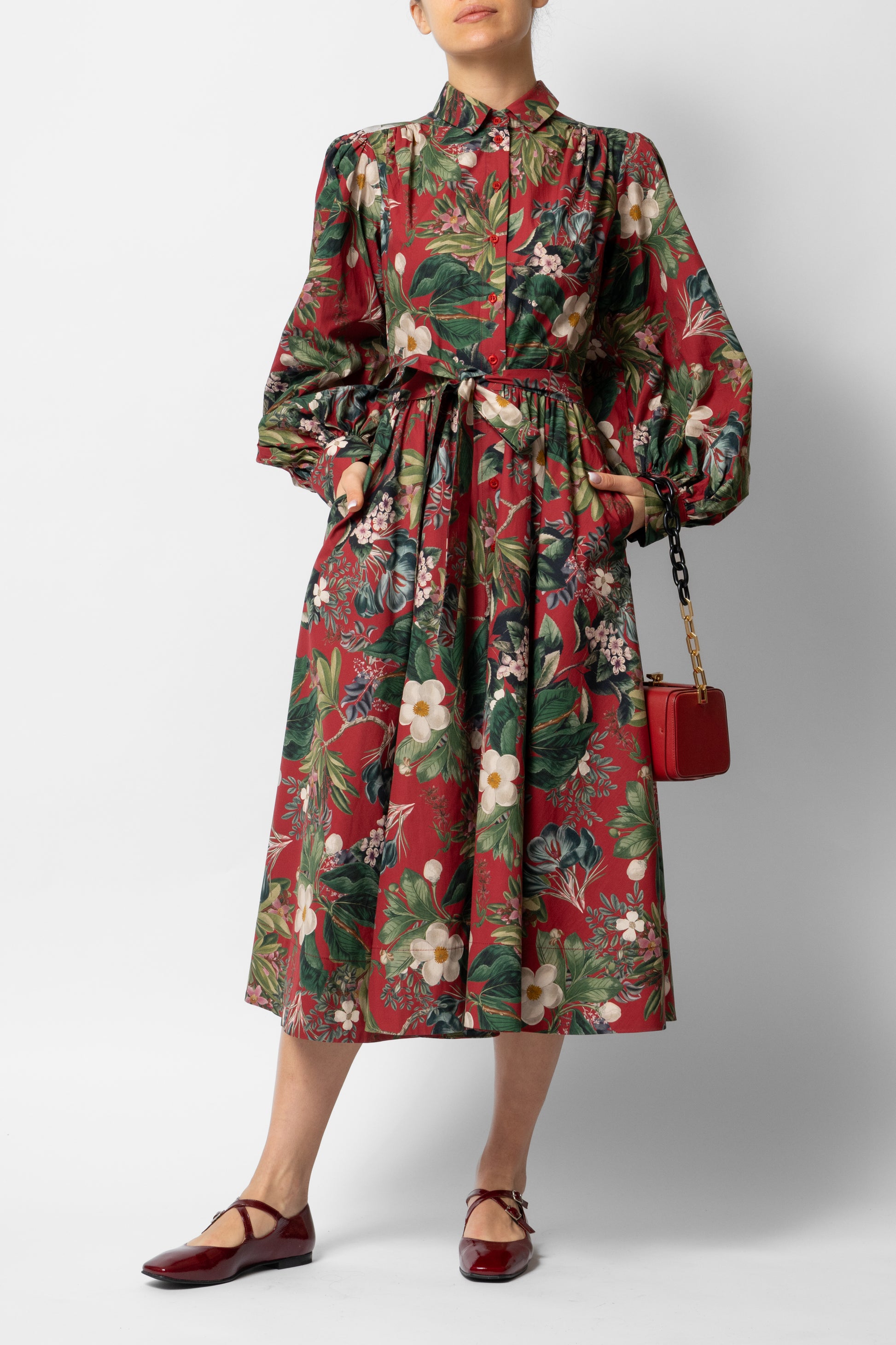Midi Shirt Dress with Puff Sleeves in Cotton, Grena