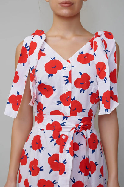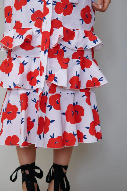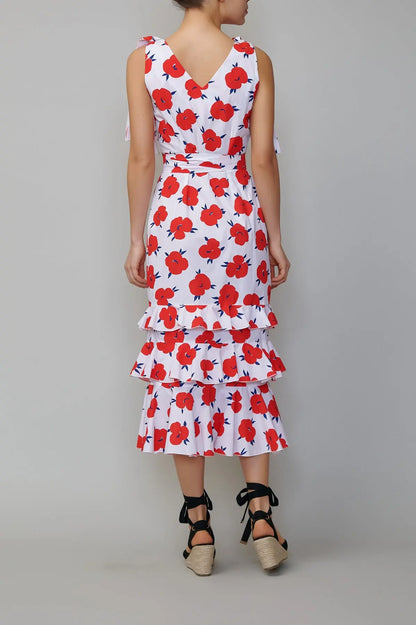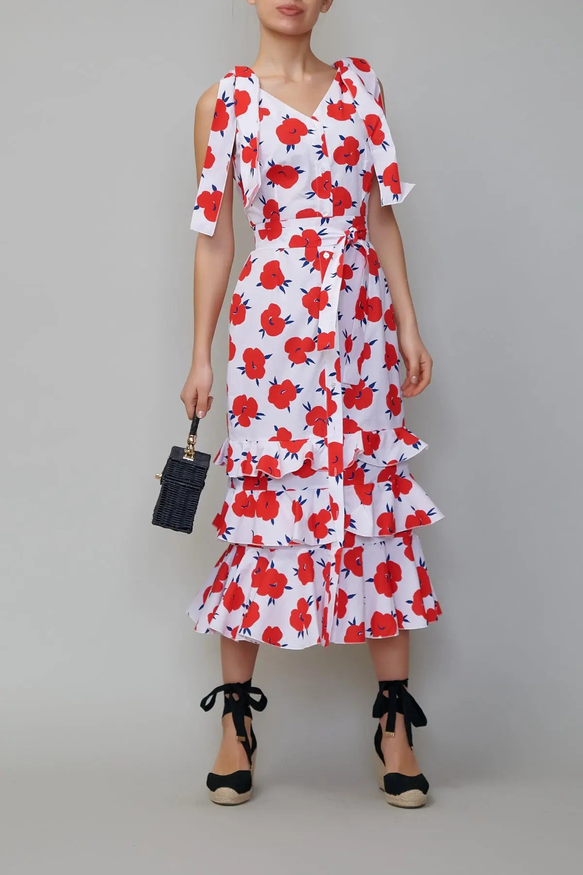 Rochie Midi fara Maneci cu Imprimeu Rosu si 3 Volane din Poplin, Alba