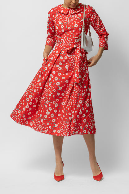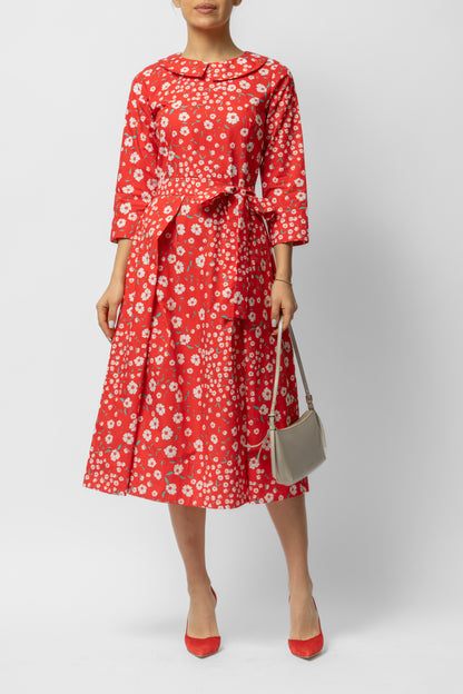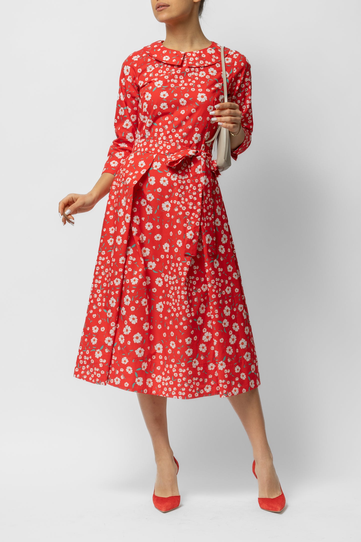 Rochie Midi cu Maneca 3/4 si Imprimeu din Bumbac, Rosie